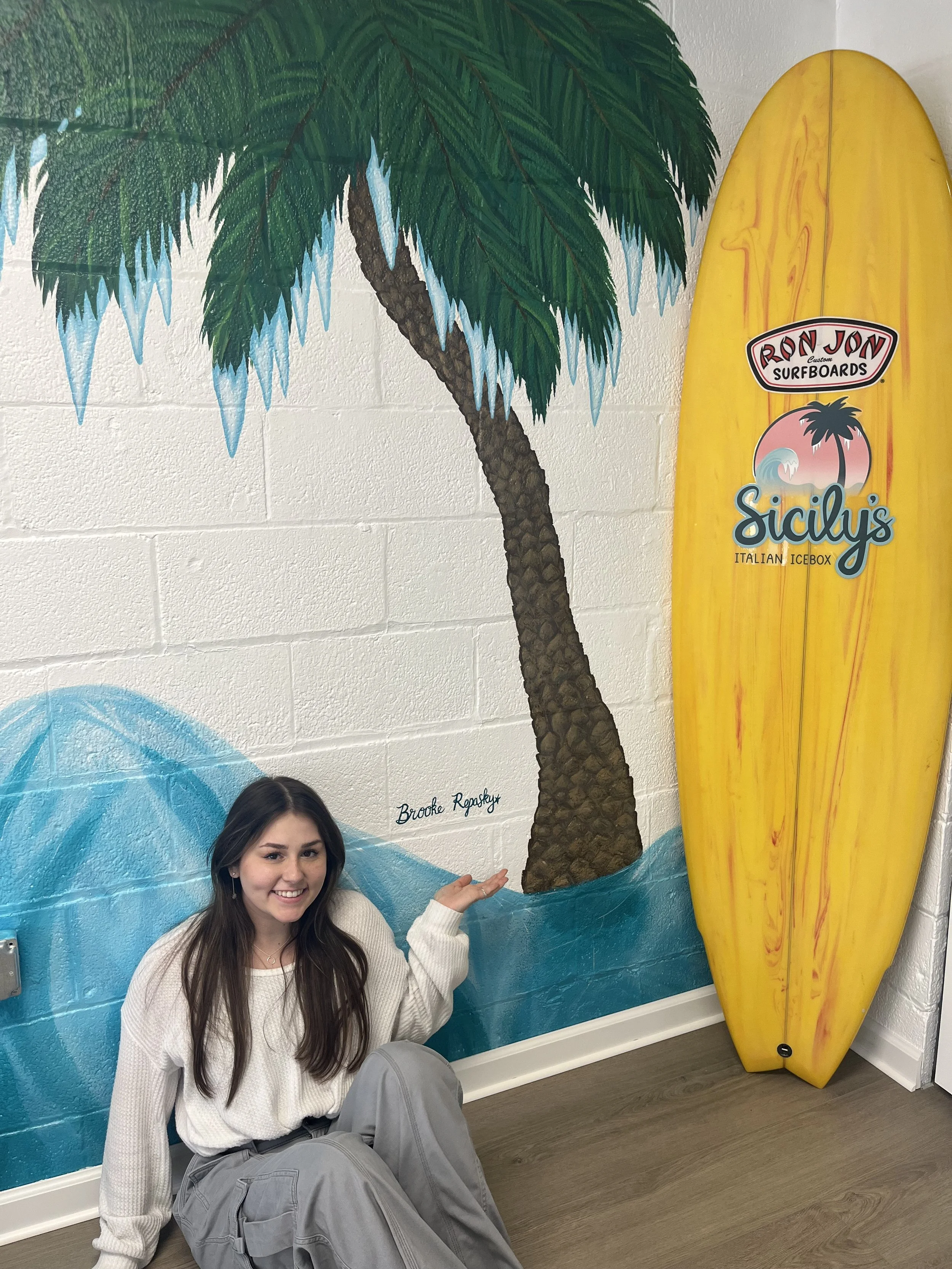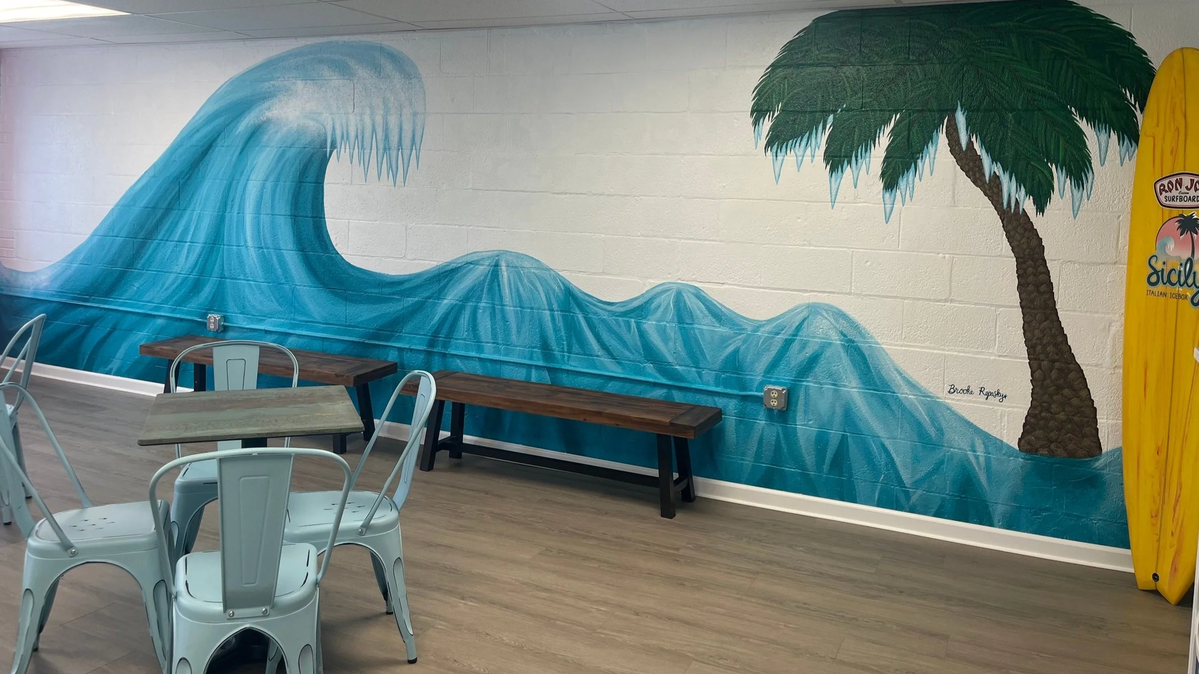 To complete the branding, I also painted a large-scale mural as the focal point of the restaurant. Illustrating a dynamic, wave-inspired scene brought the store’s icy, tropical theme to life.
